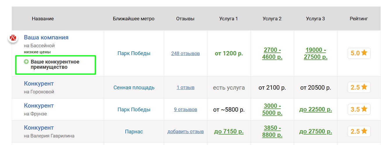 Если компания имеет конкурентные преимущества, мы можем их опубликовать на странице антикафе и показывать в таблицах в соответствующих страницах. Преимущества можно гибко настраивать для разных услуг. Правильная публикация преимуществ существенно увеличивает интерес посетителей, так как выделяет антикафе в таблицах и показывает, почему следует обратиться именно туда.
