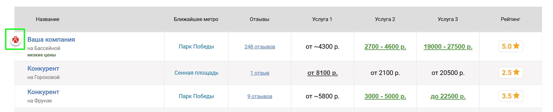 Иконка 16х16 пикселей будет отображаться слева от названия вашего антикафе в таблицах, выделяя его среди прочих. Опция увеличивает вероятность перехода на страницу компании и рекомендуется в качестве дополнения к прочим методам продвижения, в первую очередь для антикафе с узнаваемым брендом.